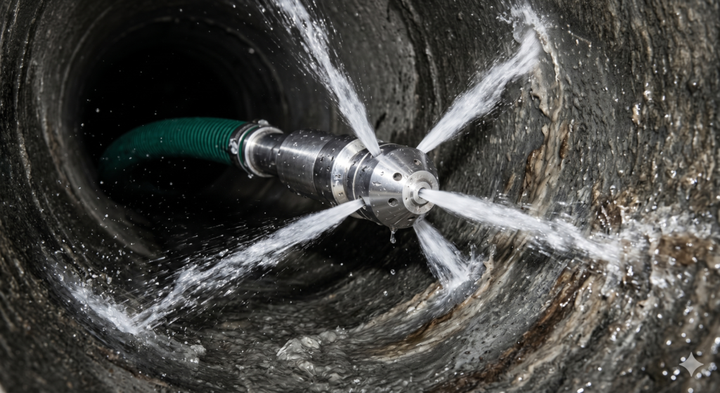 Introducimos una manguera de alta resistencia equipada con una boquilla aerodinámica (tobera). Una poderosa bomba en el camión inyecta agua limpia a presiones extremas que superan los 3000 PSI (libras por pulgada cuadrada).